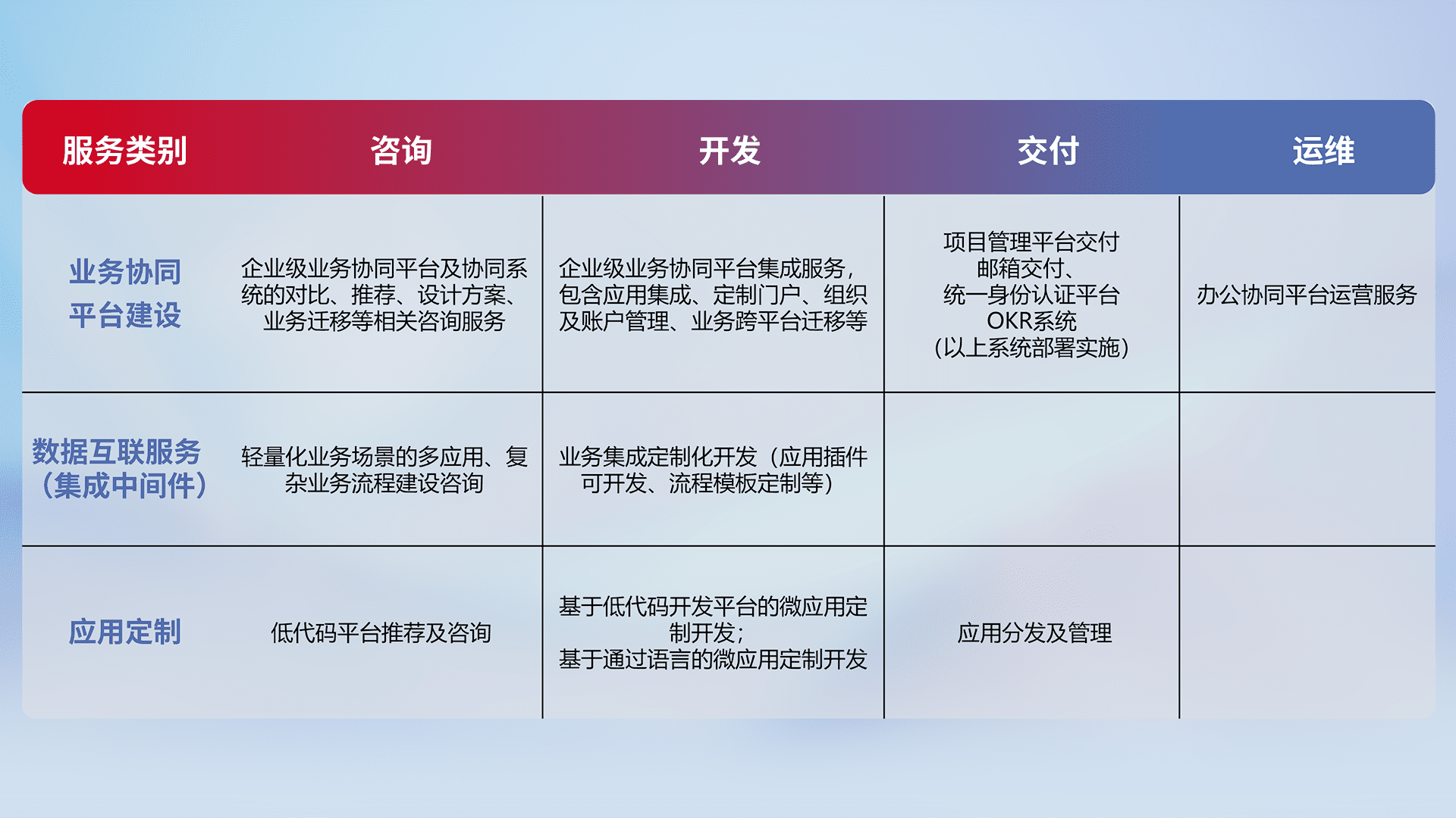 针对钉钉、、、、企微、、、、IDaas等平台级产品提供产品的规划、、方案、、、、交付、、、、定制化开发等服务,,,,实现如统一协同办公、、智能客户服务、、混合会议管理、、、智能数据查询、、、等业务场景,,实现数字化转型。。。。