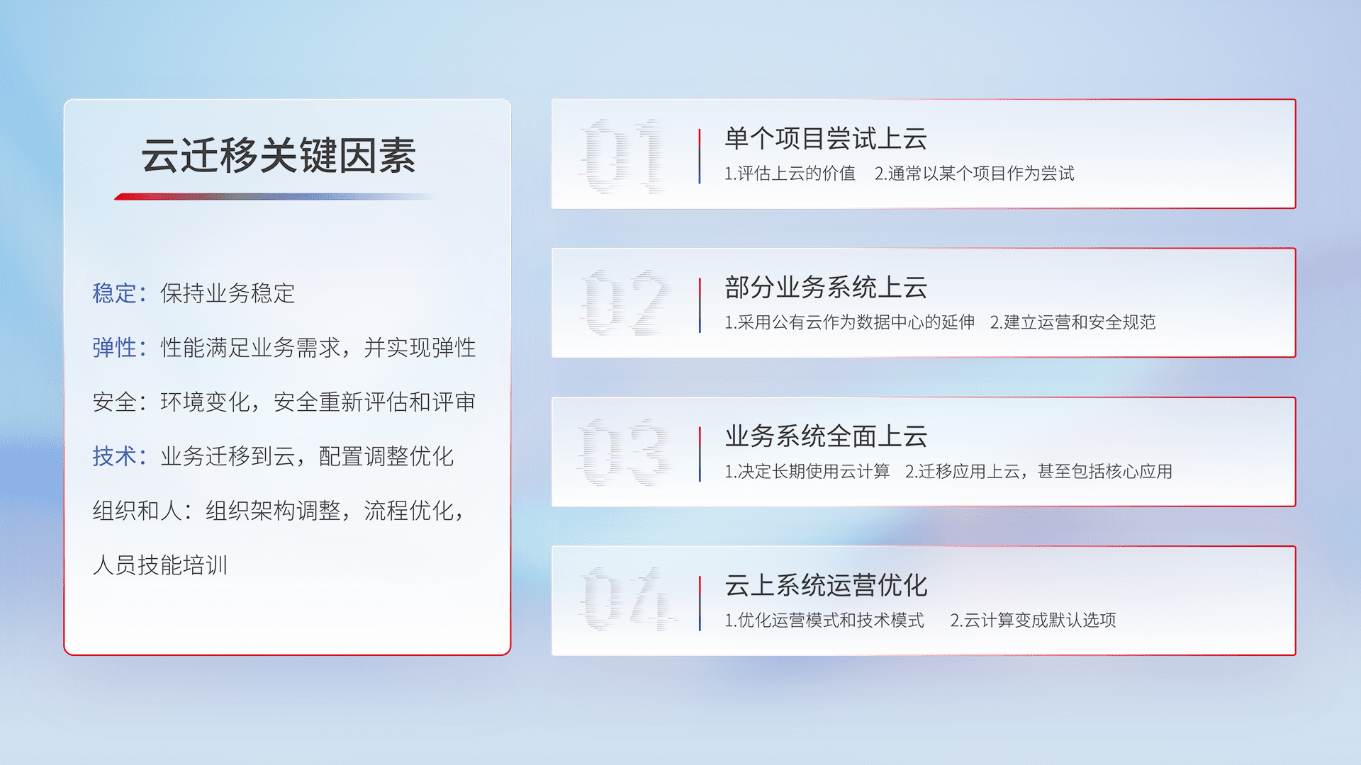 结合实际业务,,,,从规划设计、、、云平台选型、、、云原生改造、、、数据迁移、、、、集成交付,,迁移全过程为客户识别最佳上云路径,,,,做好风险识别管理,,,设计网络架构、、身份权限、、安全审计合规、、操作审计、、、日志审计、、监控告警策略、、、多站点容灾设计等,,,对云上基础设施进行整体规划,,,提升IT治理水平,,,,以满足弹性、、、高可用、、、、高性能的需求。。。